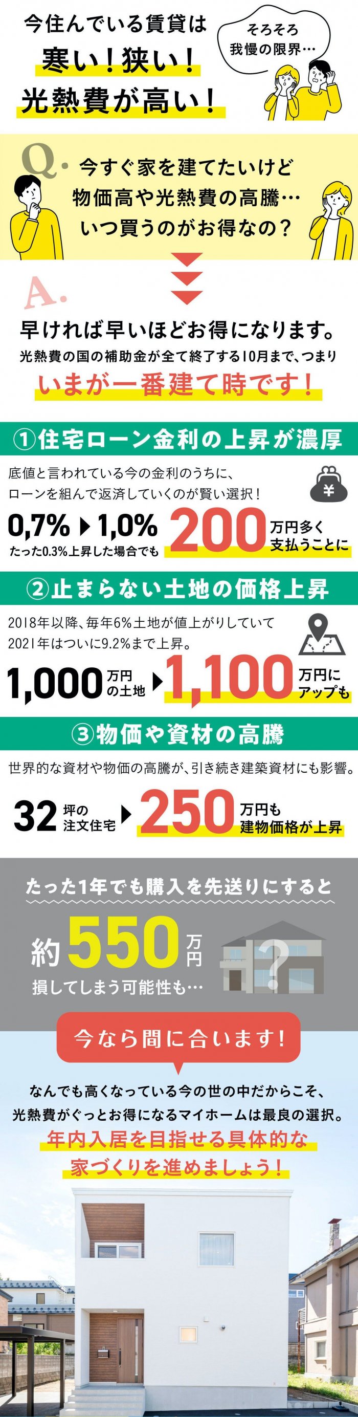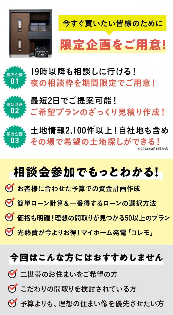 【2週間限定】お得に新築が欲しいあなたへ!今すぐ購入したい方への限定相談会 来場予約はこちら 会場 Access ジョンソンホームズ 本社 札幌市西区八軒4条東5丁目1-1 ◎JR「八軒」駅 徒歩10分 ◎駐車場完備 Googleマップで見る The JOHNSON STORE(19時以降は他会場となります) 札幌市中央区南1条西6丁目4-1 あおばアネックス ◎地下鉄「大通」駅徒歩4分 ◎立体駐車場あり Googleマップで見る ご予約 Contact 入力 確認 完了 参加希望日 ご希望の日時を選択してください。 ○受付可 △残り1枠 ×予約不可 予約日時必須 希望会場・相談場所必須 ジョンソンホームズ 本社 The JOHNSON STORE(19時以降は他会場となります) 氏名必須 姓 名 ご連絡先電話番号必須 例:0117378888(ハイフン無し) メールアドレス必須 例:sample@johnsonhome.co.jp(半角) 送信する ※ご入力いただきました情報は「プライバシーポリシー」に従って取り扱われます。 ※送信できない場合はお手数ですが sapporo@justprice.jp までお問い合わせください。